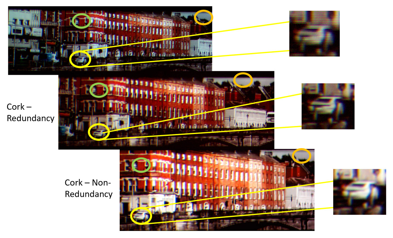 Here, the ‘Non-redundancy’ mode clearly reduced the SDE while apparently retaining equal sharpness. Impressively, the ‘Redundancy’ mode not only reduced SDE, but even appears to noticeably sharpen the image (note the zoomed-in sections showing details in the rear of the car).