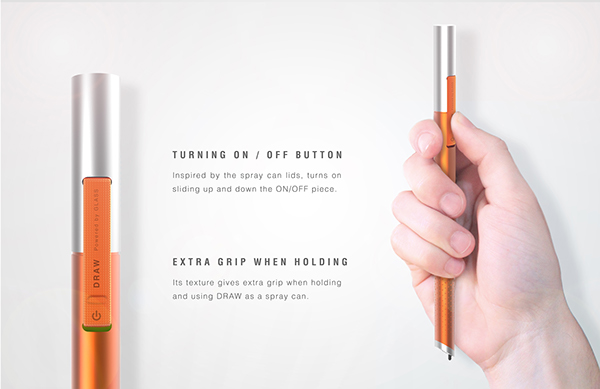 While no supporting information was included in the official patent detailing the exact function of the touchpad and button below it, the patent specifically cites a Google Glass-compatible concept device created by industrial designer Jorge Trevino as a source of inspiration. Tentatively named Google Draw (the concept was created by Trevino, and is not a Google product), the AR stylus was imagined to work as both a pen for taking notes and a spray can.
