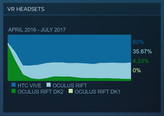 Exactly how many Rift users use Steam among the total population of Rift users is unknown, making it largely futile to extrapolate the data in an effort to determine headset market share across all platforms. However, many analyst estimates put the Vive ahead of the Rift in total sales.