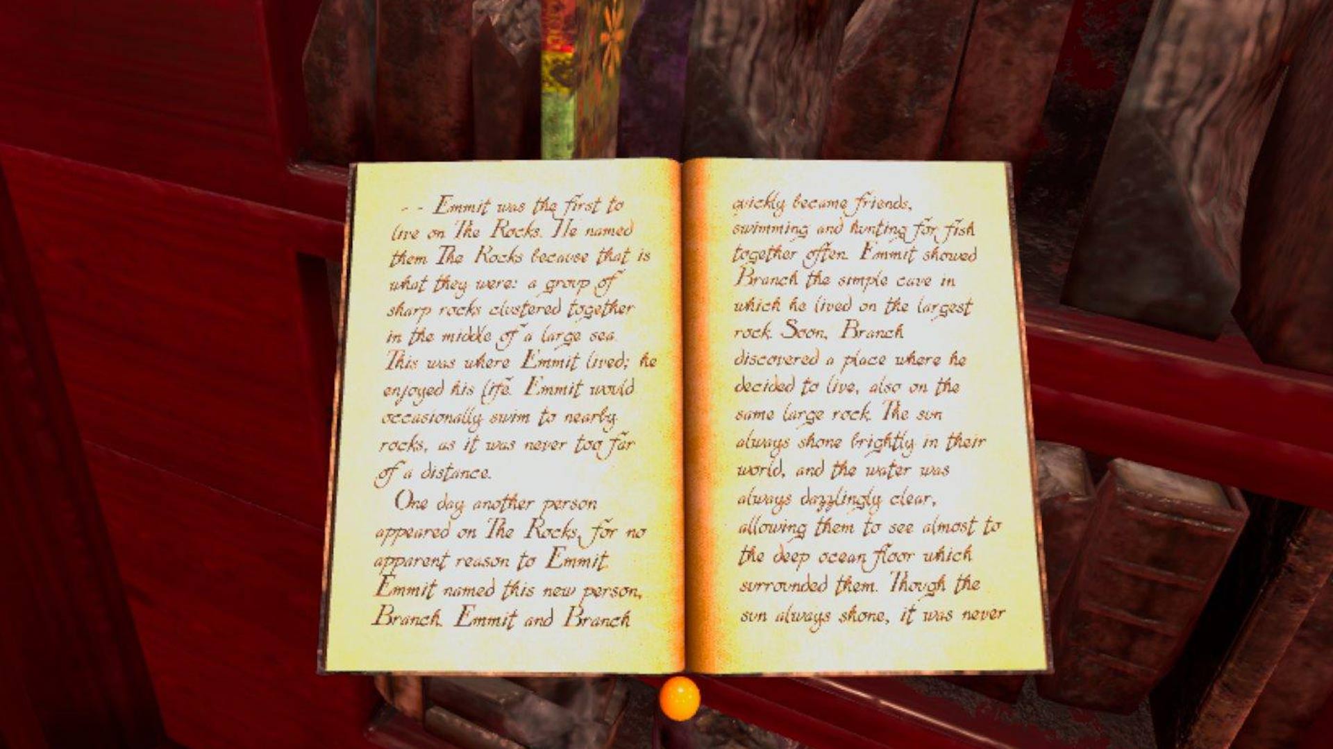 Reading in the game is actually a pretty natural experience, making books more like real objects that draw in your curiosity than on-screen manuals that you mechanically click through until you get to the good bits. A central library houses all of the game’s books, which does some of the heavy lifting in terms of world building. And the books aren’t written guides as such; some have clues and diagrams and some just tell the story of the benevolent Atrus and his two boys, Sirrus and Achenar.