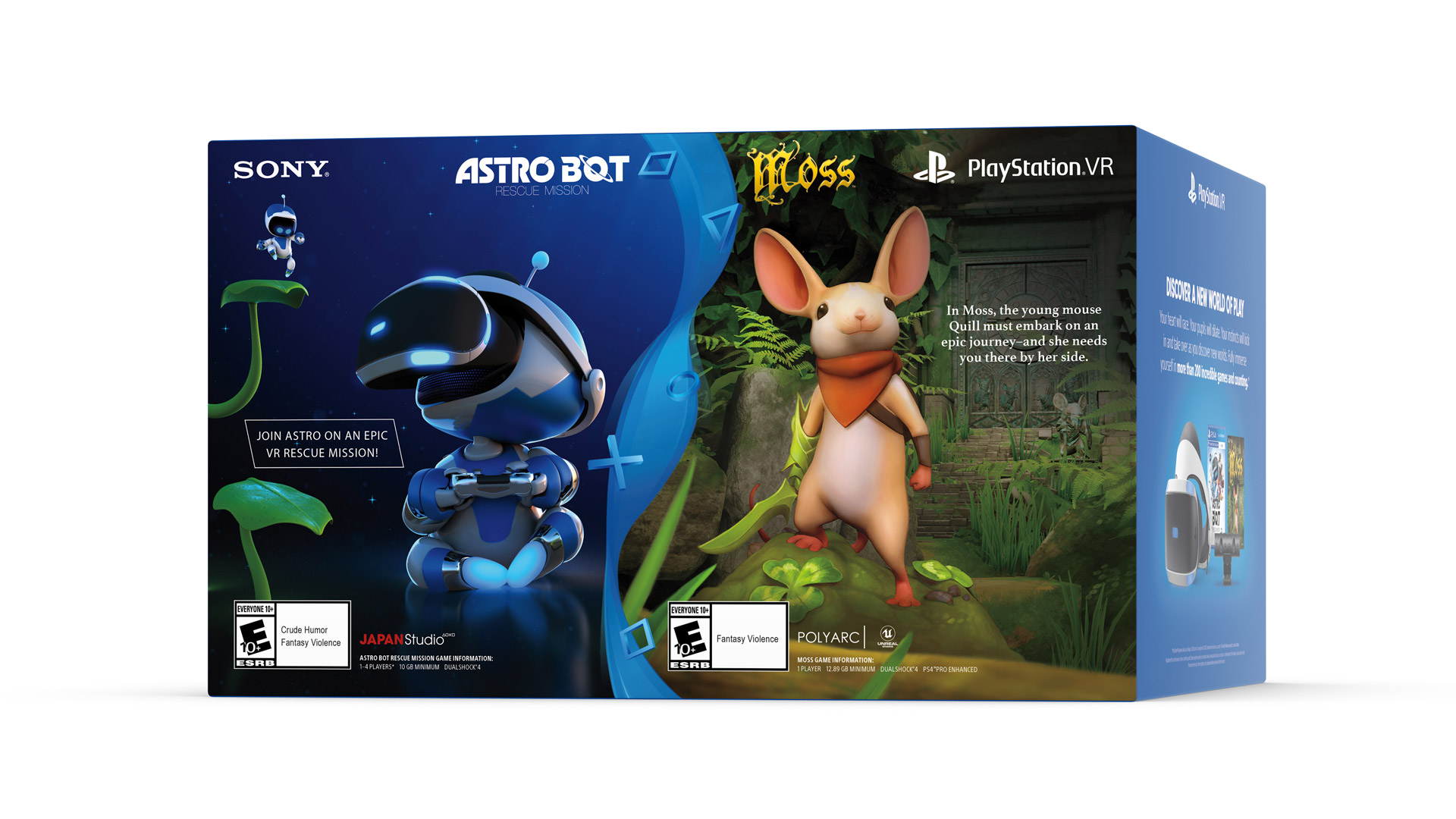 The second bundle eschews the PS Move controllers, as the two included games are played with the PS4 gamepad: the just released ASTRO BOT Rescue Mission (as a physical disc) and the acclaimed Moss (as a download voucher), the latter of which has still managed to hang onto its incredibly rare five star rating in the PlayStation Store. Together the included games would normally cost $60. See our Astro Bot review here.