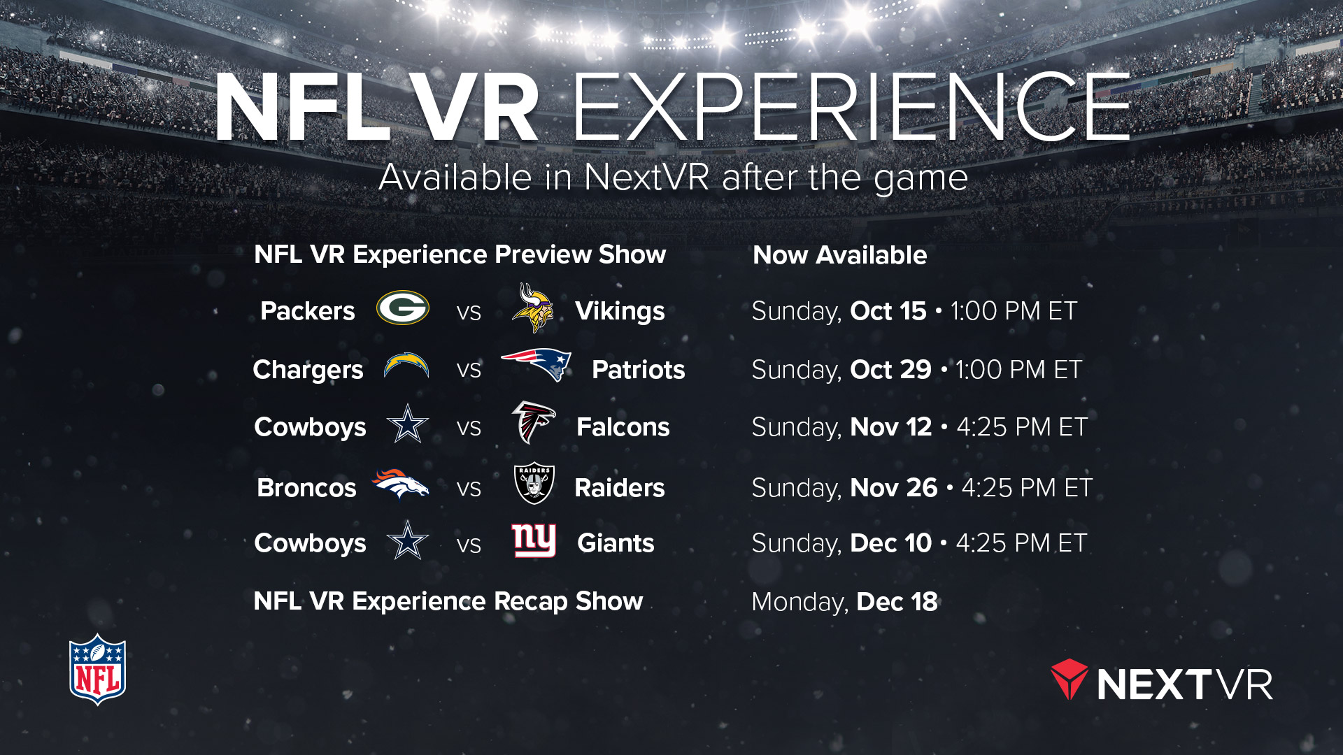 “We are thrilled to be back for a second NFL season with more games in addition to the VR studio shows with Reggie Bush,” said NextVR CEO David Cole. “NFL fans expect the best and want to be as close to the action as possible. At NextVR we continue to evolve and improve the fan experience through our technology in collaboration with NFL Films to deliver a premium virtual reality production.”