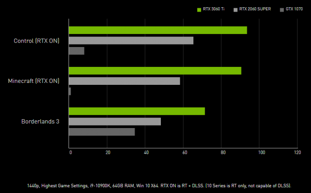 Although Nvidia says the card can outpace the RTX 2080 Super, we haven’t found any detailed data released by the company on that claim just yet. However, it did put out some data on the 3060 Ti vs. RTX 2060 Super vs. GTX 1070 by comparing framerate in two ray-traced games and one game without ray-tracing.