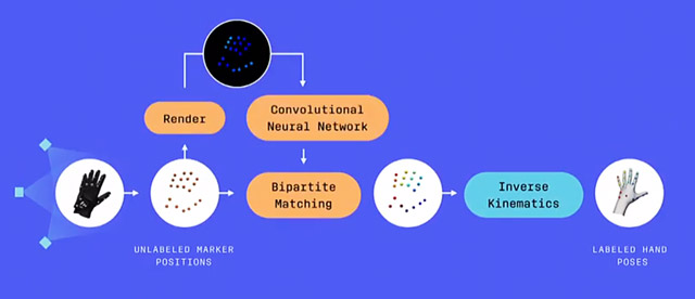 Guajardo explained that the company used a marker-based tracking system to record hand interactions in high fidelity, and then condensed the recorded data into 2D imagery which allowed them to set a convolutional neural network to the task of uniquely identifying the positions of the markers across a large set of hand pose imagery, effectively allowing the system to learn what a hand should look like given an arbitrary set of marker positions. Ostensibly, this trained system can then be fed markerless camera input of a user’s hands and solve for their position.