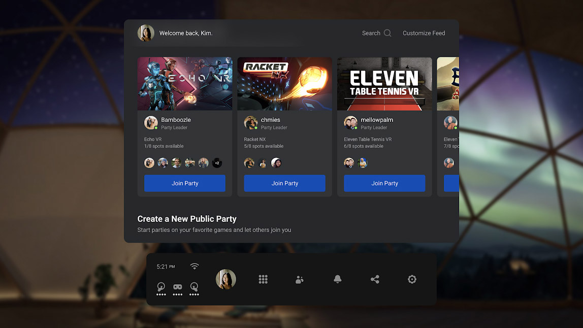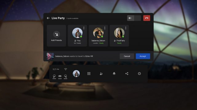 Accessed from the headset’s dashboard, the existing Party system allows up to four players to join a group voice chat even if they’re in different apps. Now with the new Travel Together feature, Party members can launch into supported apps together and get seamlessly placed into the same lobby or match.