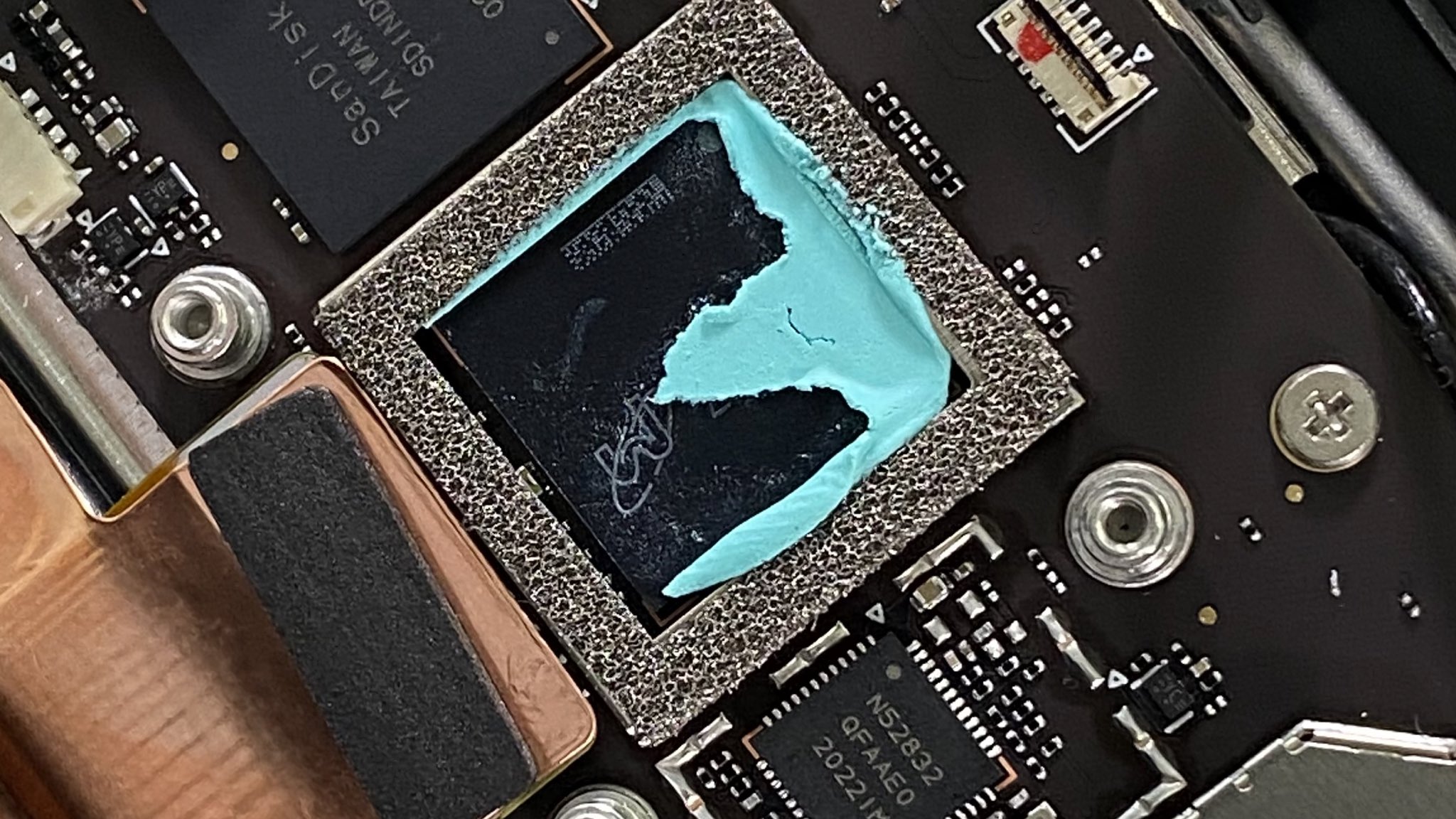 Removing the motherboard entirely and we find more thermal compound on what appears to be an EM shield doubling as a passive cooling heatsink.