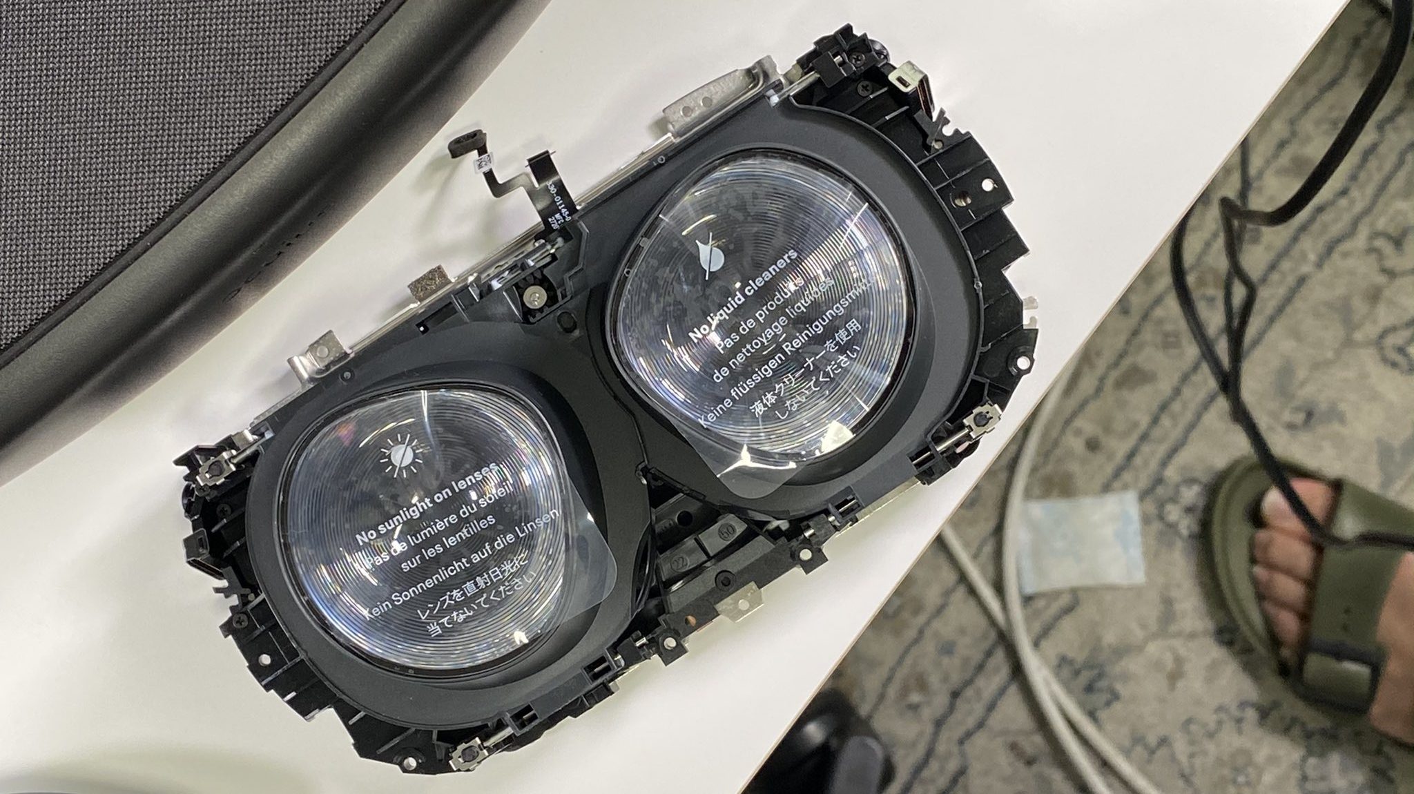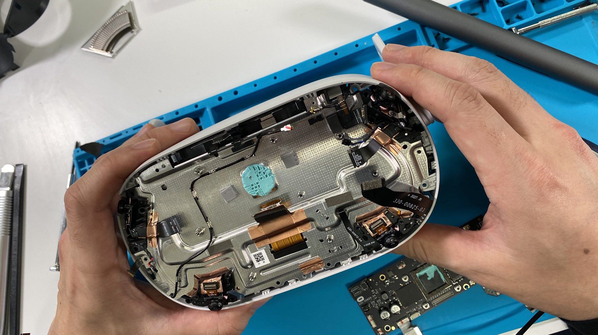 Interestingly enough, it’s actually one of the first pieces you’ll see when disassembling the headset, as it sandwiches between the Quest 2’s guts and the top interior of the white plastic casing. Here’s GOROman screwing back into place during reassembly. Yes, he really put it all back together.