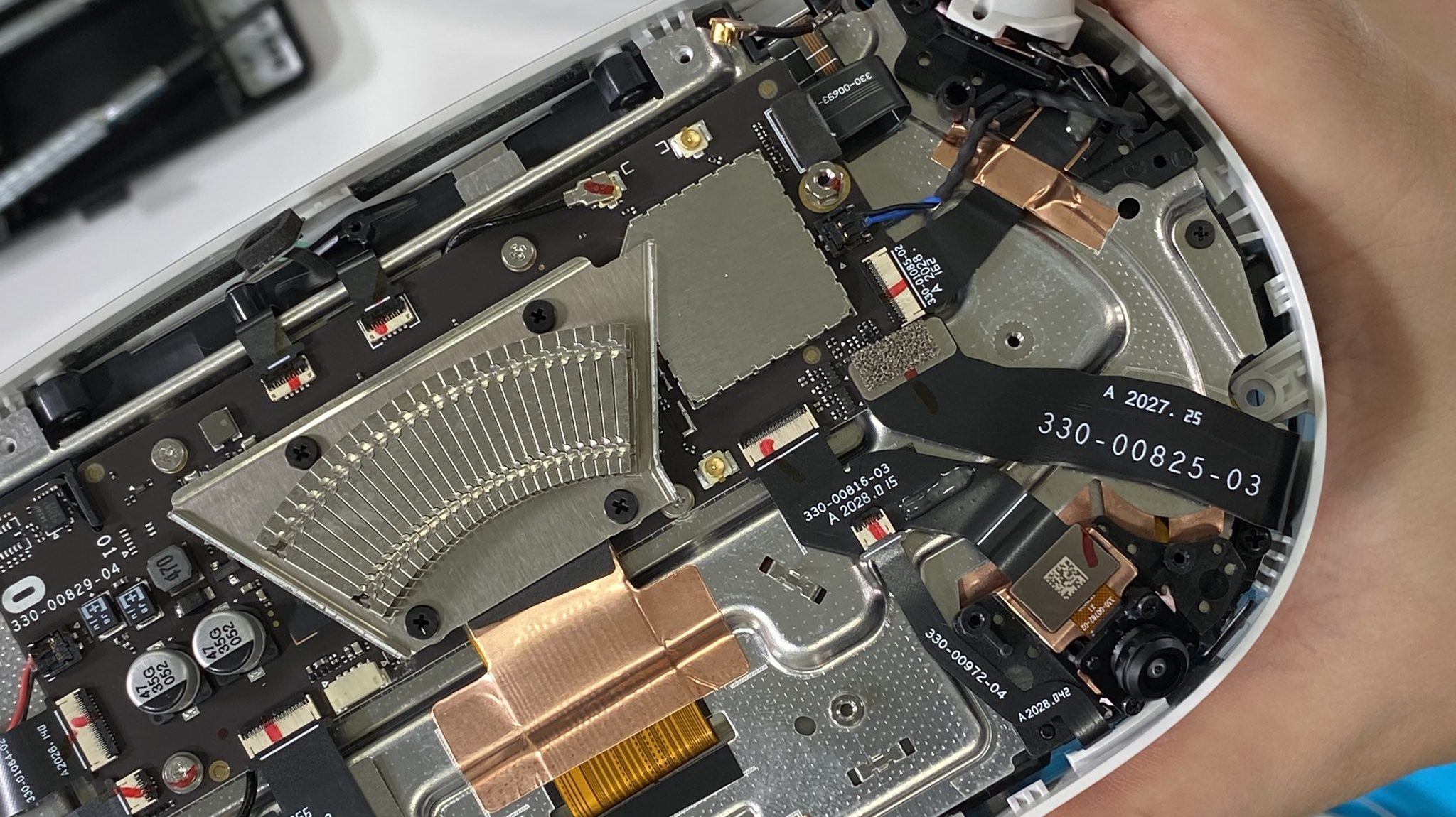 Heatsink removed, we can now see the Snapdragon XR2 chip, replete with thermal compound for ensuring good heat transfer from the chip to the heatsink. On the left you can just make out the headset’s internal storage, built by SanDisk.
