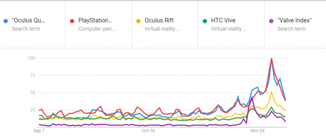When it comes to peak worldwide search volume over Black Friday weekend (which factors in PSVR’s significant popularity in Europe), Quest was nearly tied with PlayStation VR, both of which significantly led Oculus Rift, HTC Vive, Valve Index, and others by 2 times or more.