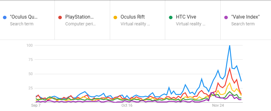 When it comes to the most-searched-for headsets, there’s been three clear leaders during the 2016, ’17, and ’18 holiday shopping seasons: PlayStation VR, Oculus Rift, and HTC Vive. Released earlier this year, Oculus Quest has entered the fray and made a big splash. According to Google Trends, Quest dominated search interest in the US over Black Friday weekend which marks the start of the holiday shopping season.