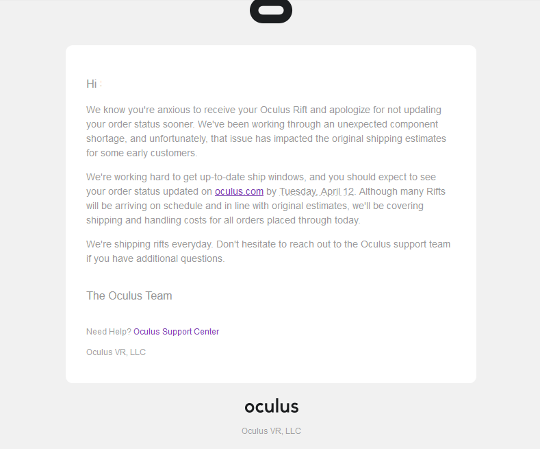 Are you still waiting for updates on your Oculus Rift order? Have you received a similar email to the one above? Let us know your shipping woes below in the comments section.