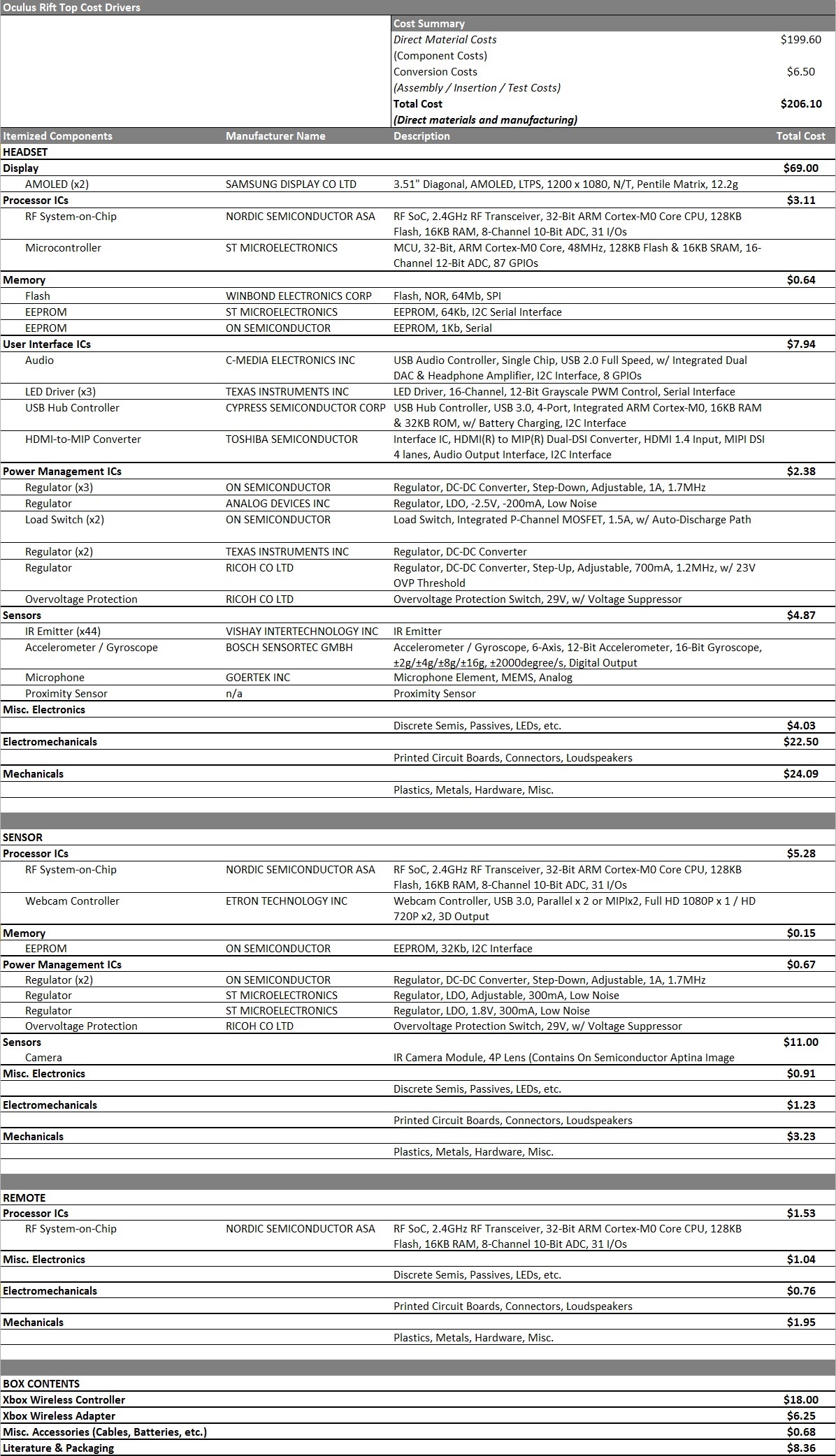 All of this of course fails completely to include the years of R&D that went into producing a the Rift, not to mention hugely complex and software development to support the headset, a lot of which simply didn’t exist prior to the recent VR renaissance. Not to mention this report is almost entirely focused on material electronic costs, there’s no mention of the custom Fresnel lenses manufacturing costs, for which you also have to factor in the complex specialist R&D for those too. Finally, this report is based on estimates of individual costs without any knowledge of commercial arrangements based on bulk – we’ve no real way of knowing how much Oculus paid or are paying long term for these parts.