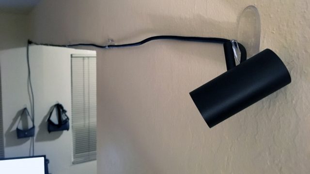 - Thread the Sensor’s cable behind the hook (as if hanging the Sensor by the cable) with the Sensor head’s stem on the opposite side. Lean the back of the Sensor against your wall at an angle pointing at the opposite corner of the playspace through the center; adjust the tilt of the stem to get the Sensor to stay at the desired angle. If your walls are slick and the camera doesn’t stay at the correct angle, use a small loop of scotch tape between the camera and the wall to provide enough friction for the camera to lean against.
