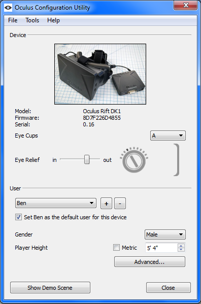 The Oculus Configuration Utility has been updated in conjunction with the new SDK. The Utility now allows the user to indicate the eye-relief setting of the Oculus Rift DK1 (how far the lenses are from the user’s eyes). This info is used with the new distortion technique to maximize distortion quality.