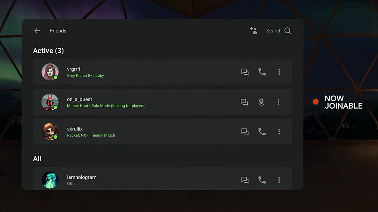 When it comes to social VR experiences today, if you want to meet up with a specific person to play a game, watch a movie, or hang out, the process often involves using a communication channel outside of your headset (like a messaging app) and setting a time to put on your headset and which specific game you will launch and join. If all goes smoothly, you join each other in a lobby and then launch into whichever activity you planned to do.