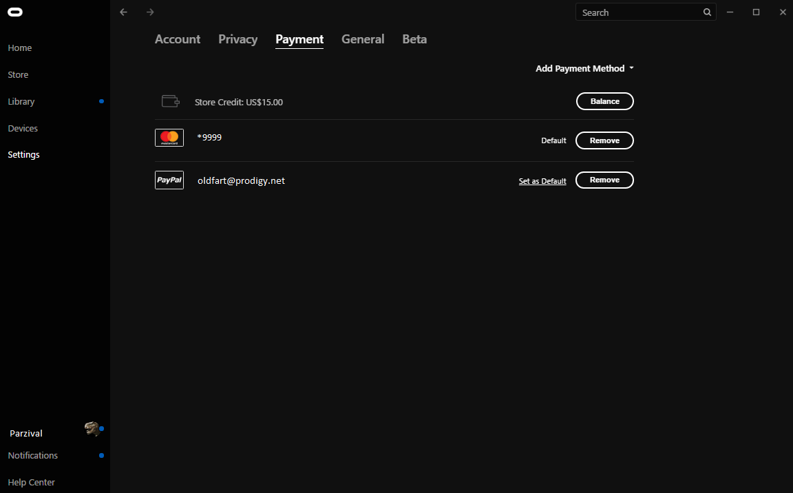 If you’re in the US, you should already have $15 sitting in the ‘Payment’ section of your account or a local equivalent depending on your home currency. If you’re using the app, simply head to ‘Settings’ and click over to the ‘Payment’ section. If you’re using the Oculus web portal, click over to your profile, and you’ll see it displayed under ‘My Payment Methods’.
