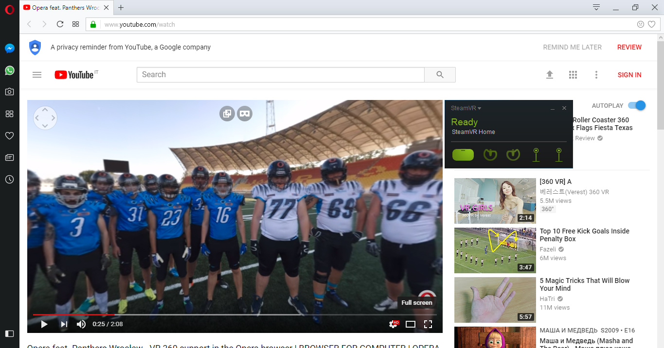 The latest Opera developer browser automatically detects whatever VR headset you have via OpenVR, Steam’s API that allows multiple headsets to hook into Steam content. From a user’s perspective, all you have to do then is navigate to a 360 video and press the ‘VR mode’ button.