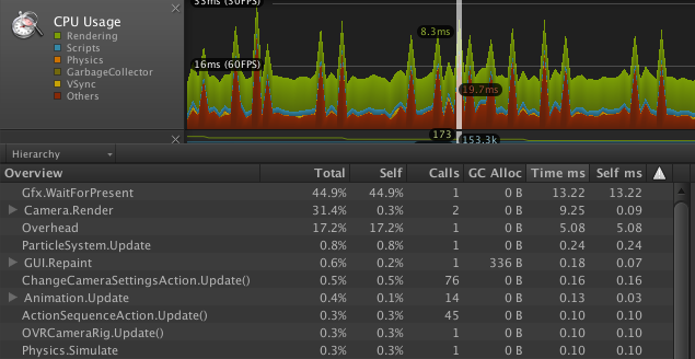 Above is an example of an application put through Unity’s profiler that has caught a perceived error, something called Gfx.WaitForPresent, a performance issue that Pruett maintains should be ignored “in the profiler and [rather] concentrate on optimizing everything else.”