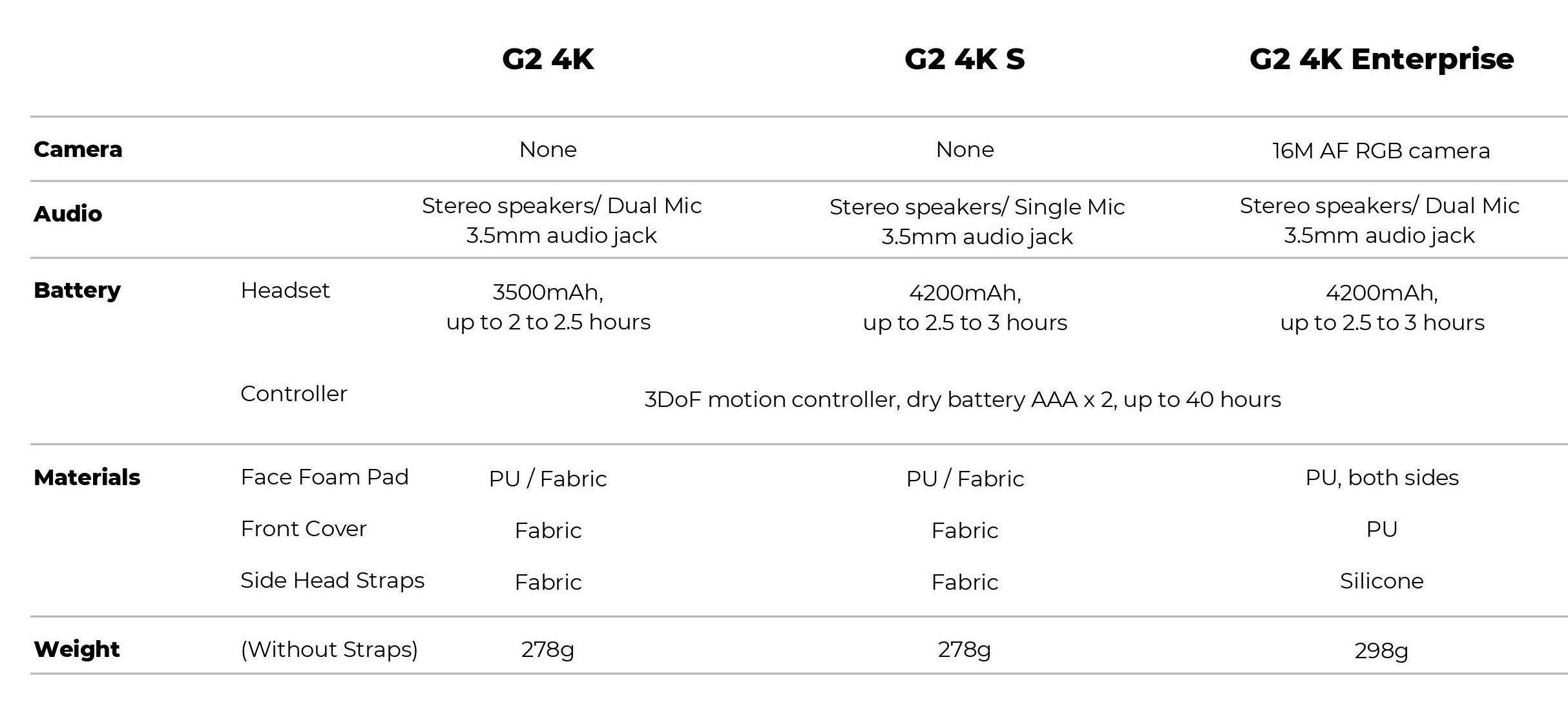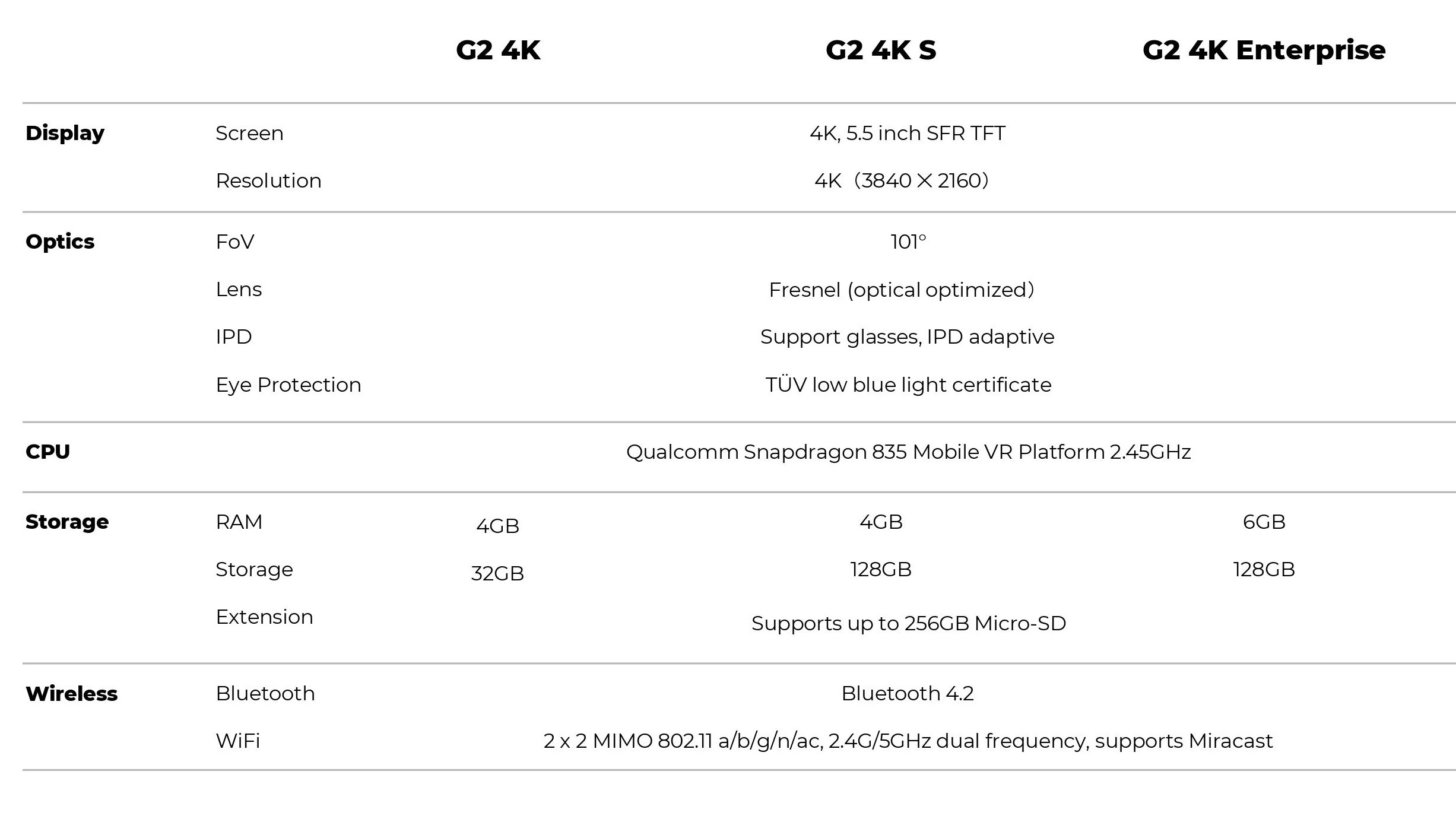 Originally released in North America in May 2019, the standard G2 “4K” offered enterprise customers a higher resolution screen to Oculus Go’s 2,560 x 1,440 resolution (1,280 x 1,440 per eye) and a greater degree of personalized business support than Facebook was providing through its Oculus Go for Business program at the time. Both headsets only offer 3DOF head tracking, and include a single 3DOF controller.