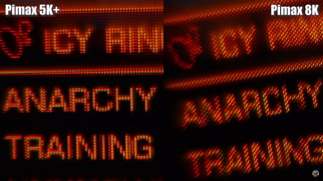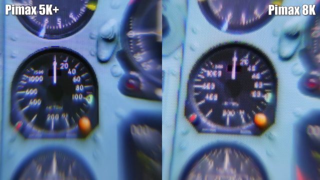 The difference in fidelity seems to stem from different display types used in the “5K” Plus and the “8K”. Detailed macro photos from SweViver, one of the backers who previewed the headsets, shows that the “5K” Plus uses an RGB-stripe pixel layout with rectangular pixels, while the “8K” appears to use a PenTile-like layout with what appear to be round sub-pixels.