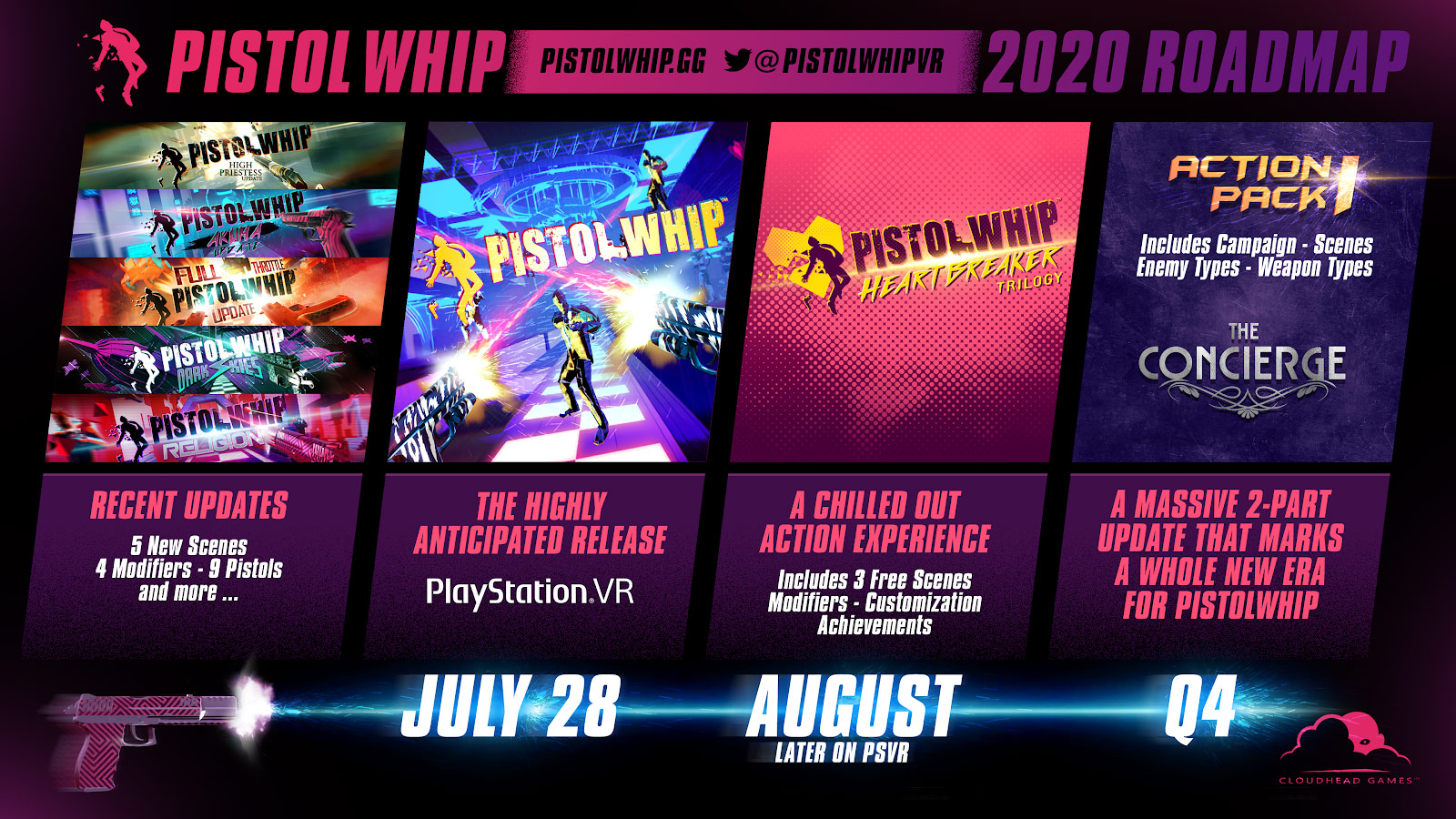 Hit VR rhythm shooter Pistol Whip got a brand new DLC level today on PC VR and Quest. Developer Cloudhead games also shared its long-term roadmap, including DLC planned for Q4 which will mark “a whole new era” for the game with a “cinematic campaign built from linked scenes.” The studio also announced a July 28th release date for Pistol Whip on PSVR.