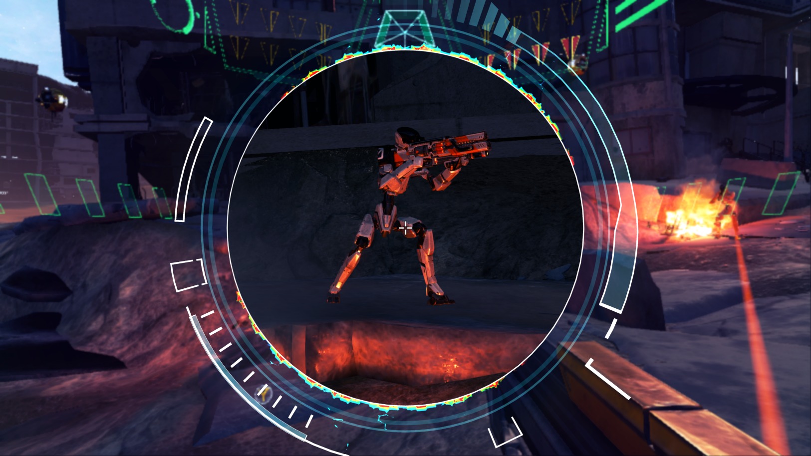 The demo I played at the pre-GDC Oculus press event was one of your standard FPS ‘protect the whatever’ mission, in this case a drop ship from the rebel faction. Navigating through a series of broken buildings by way of hacked robot enemies and a friendly (and suspiciously convenient) non-combatant camera drone, I made my way to football field-size opening featuring a ton of incoming bots attacking the ship. Up until then I only had command of a single robot type, a laser rifle-firing human robot that had the ability to zoom in with its sniper scope.