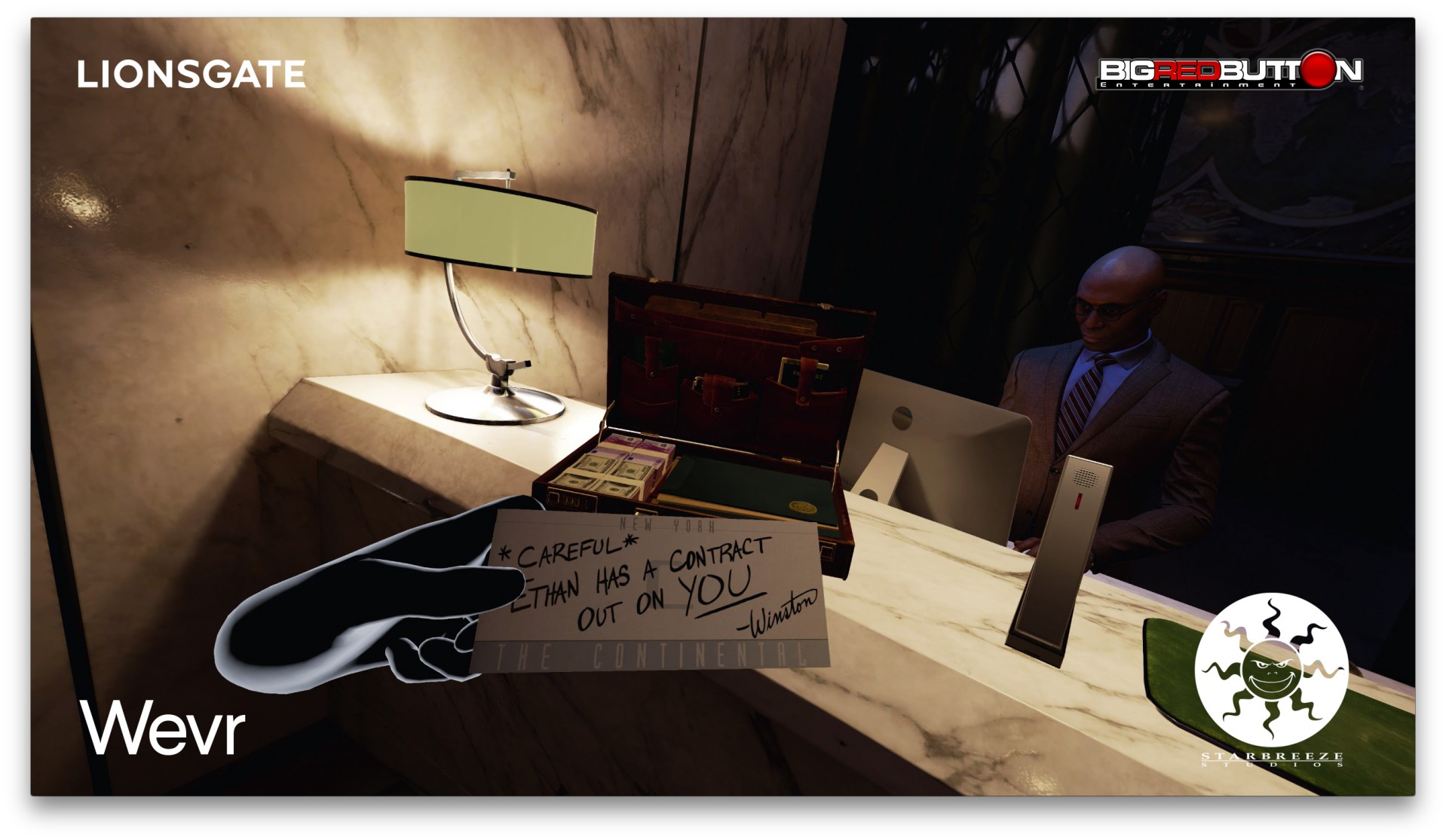 The experience starts out in the lobby of The Continental, the film’s sanctuary for assassins that has a strict ‘no business’ policy. Walking up to the lobby’s reception desk, a phone rings. Picking it up and holding it to my ear with the Vive controller, I hear a mysterious voice on the other end telling me to get the concierge. I ring the bell, and a photorealistic Chanor, the hotel’s manager played by Lance Reddick, welcomes me back. Reaching into my briefcase I pull out a fat stack of 500 euro bills, but Chanor isn’t having any of it. This hotel only takes gold coins, and I just so happen to have one in my briefcase.