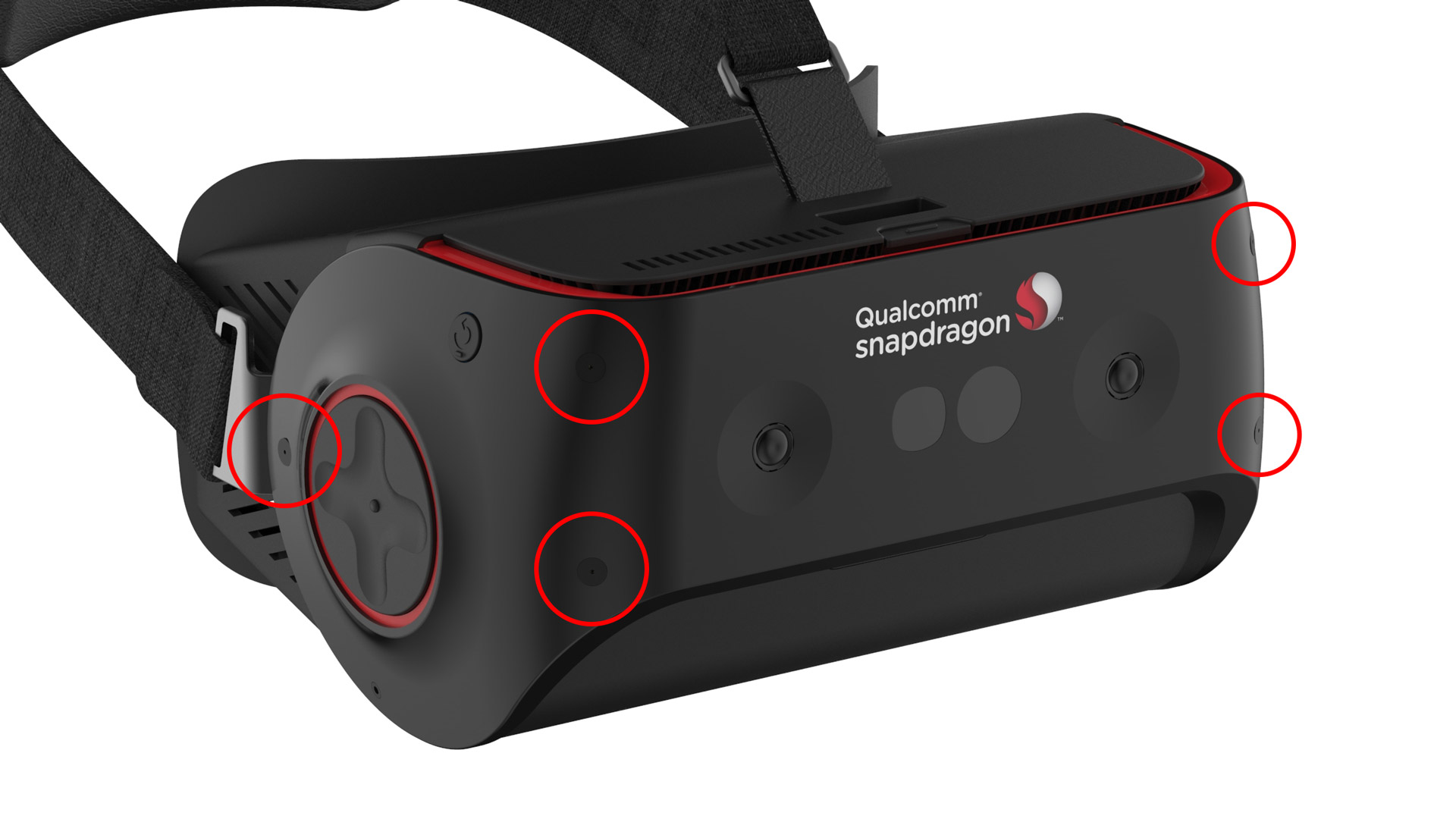 While Oculus has been working on an optical 6DOF controller tracking approach on their Santa Cruz prototype, Qualcomm’s new Snapdragon VRDK hopes to solve the problem with ultrasonic tracking, which uses inaudible sound waves to triangulate the position of an object in space. The latest images of the reference headset show what appear to be six ultrasonic emitters (and/or receivers) on the headset, three on each side. These would be used to either send or receive ultrasonic signals to corresponding controllers, while differences in timing from each of the signals is used to calculate position, which would likely be fused with rotational data from an onboard IMU.