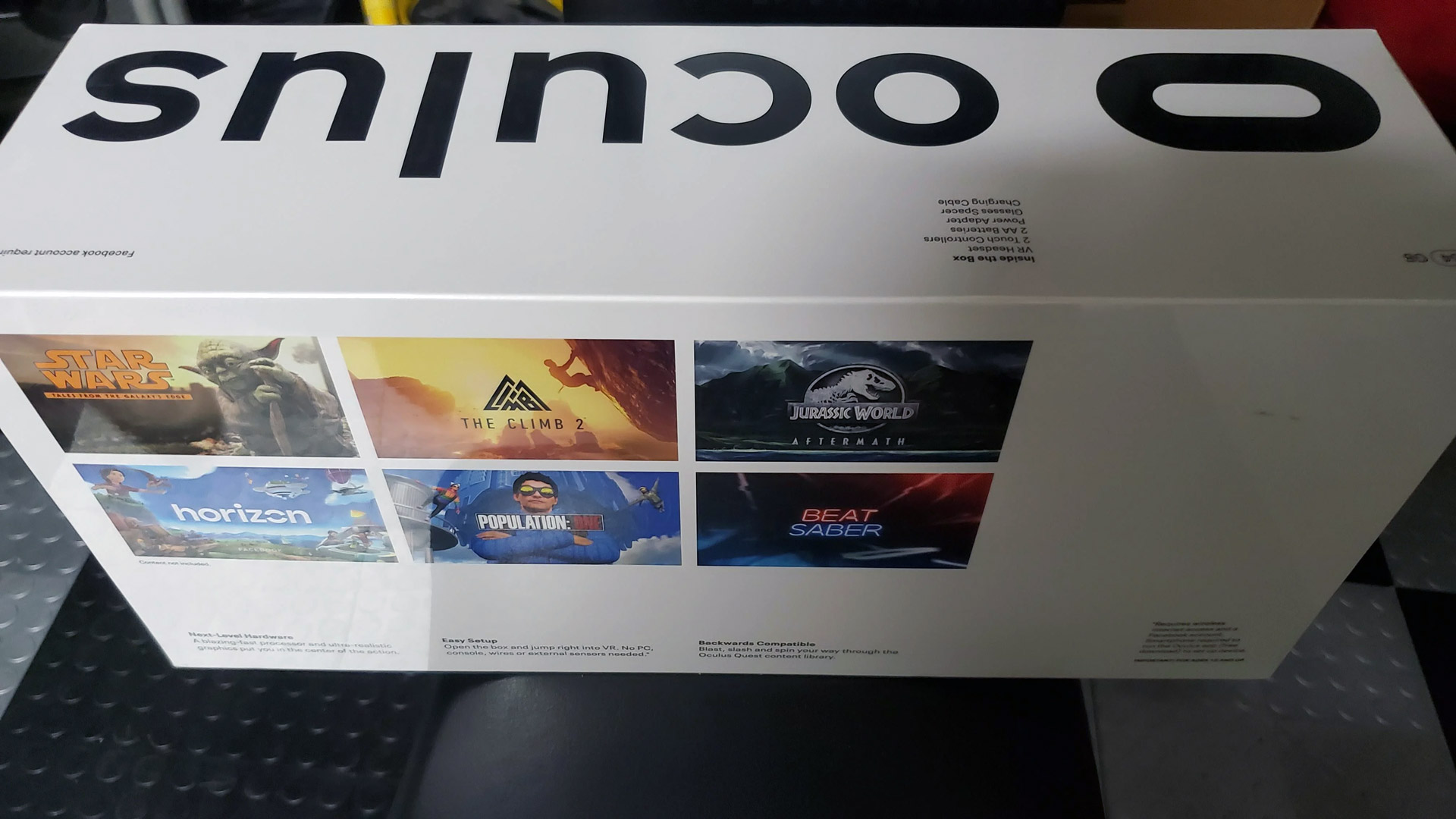 The back of the box highlights six games coming to the headset, two of which were previously unknown: The Climb 2 and Jurassic World: Aftermath. The other games on the box are Star Wars: Tales From the Galaxy’s Edge, Horizon, Population: One, and Beat Saber.