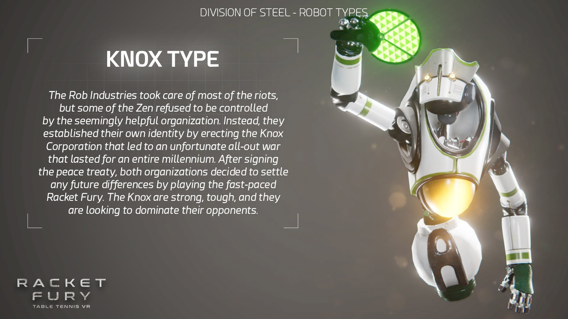 Thanks to the hint of sci-fi backstory on the game’s Steam page, we know that the action takes place in the ‘Crown Galaxy’, a place inhabited by the ‘Zen’ robot, who introduced the ‘Racket Fury Tournament’ to maintain the peace. In the single player campaign, you assume the role of a Zen, challenged to face the ‘Division of Steel’, a prestigious team of robots that have dominated the competition. The four main robot types, which increase in difficulty, have been detailed on the Racket Fury twitter account. The developers claim that the advanced opponent AI means that each robot “has their own temper and an utterly unique style of play.”