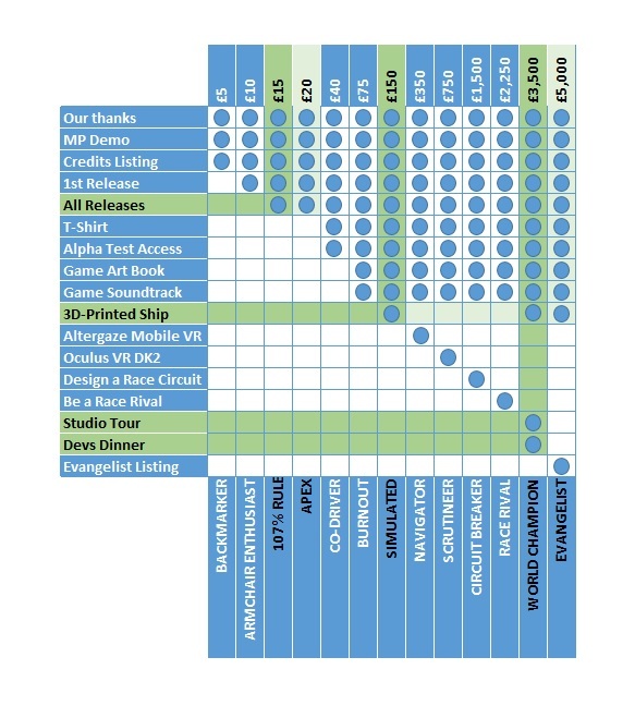the forthcoming multiplayer demo and access to a digital download of the 1st release, expected to include 3 worlds with 3 tracks each. Push the boat out further however and you could grab a custom 3D printed Altergaze unit, Dinner with the developers or a customized Oculus Rift DK2. For a breakdown of the rewards associated with the tiers, Tanmeka have provided this handy matrix on the right (click for larger view).