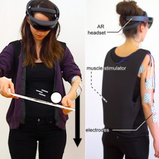 Researchers at The Human Computer Interaction Lab at Hasso-Plattner-Institut in Potsdam, Germany, published a video recently showing a novel solution to the problem of wearable haptics for augmented reality. Using a lightweight, mobile electrical muscle stimulation (EMS) device that provides low-voltage to arm muscles, the idea is to let AR headset-users stay hands-free, but also be able to experience force-feedback when interacting with virtual objects, and feel extra forces when touching physical objects in their environment too.
