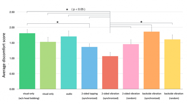 To check their work, the researchers also ran the same tests with both visual and auditory stimulation (artificial head bobbing and footstep sounds) without any haptics to isolate any effect. They also ran tests with randomized haptic stimulation to tell if the synchronization of the stimulation mattered to the outcome.