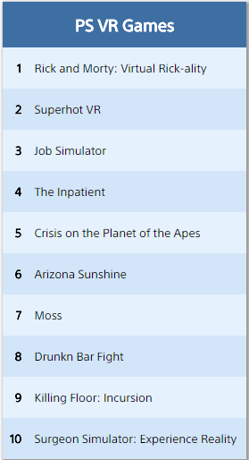 Rick and Morty: Virtual Rick-ality was developed by Owlchemy Labs, the same minds behind Job Simulator, and was voiced by many of the actors from the TV series, including show creator Justin Roiland. First launching on Steam and the Oculus Store last year, it then made its way to PSVR on April 10th, giving it only around three weeks to reach the top.