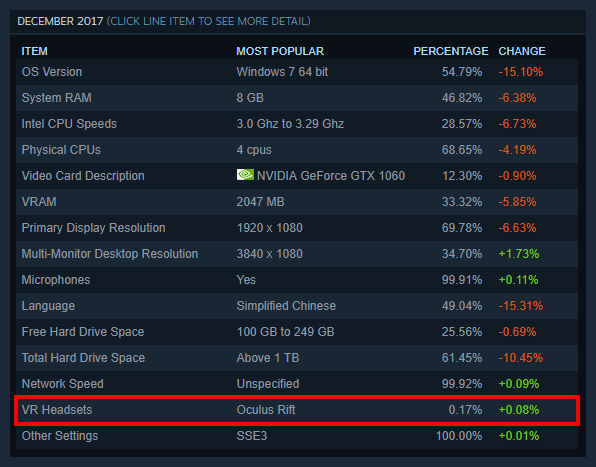 Though it seems to have been a strong holiday season for VR headset sales—with reduced prices and bundles aplenty—most of the gift giving falls toward the end of December; with some folks likely busy with family and friends through New Year’s, we won’t likely see the true impact of the holiday season on Steam’s figures until January’s data is published.