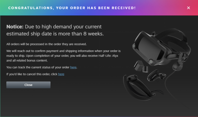 After making new Index stock available today after more than a month of the hardware being sold out, most regions saw the headset and other hardware quickly backordered by eight weeks or more.