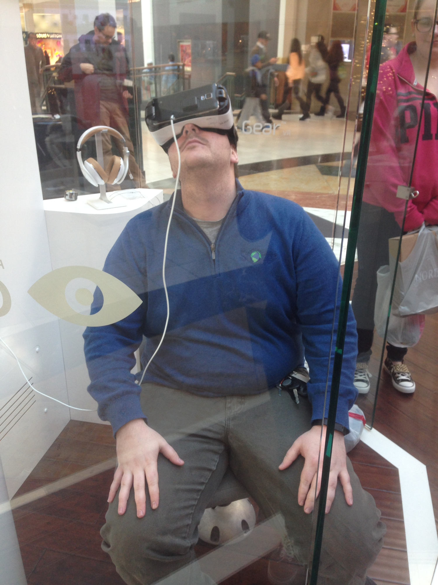 At the King of Prussia Mall, Samsung has seen fit to install a pop-up booth in one of the mall’s busy corridor hubs. The pop-up booth lets shoppers get their hands on Samsung’s latest gadgets, including Gear VR—which takes up residence in a glass enclosed demo area which is branded with Samsung and Oculus logos.