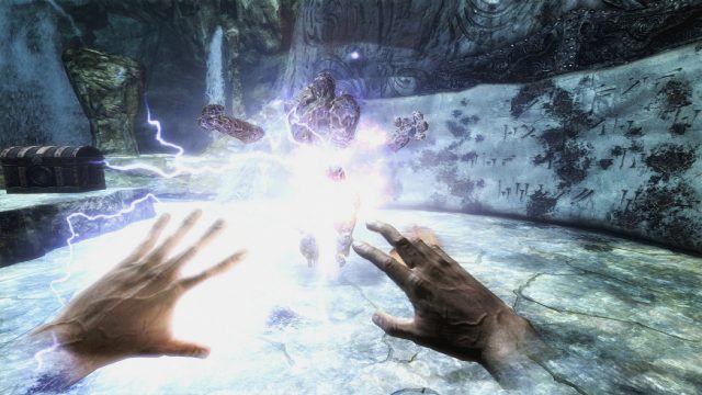 Skyrim VR combat in not particularly visceral—hitting enemies with melee weapons largely feels like a hit-check rather than a blade slicing into flesh, while casting offensive magic feels like a point-and-hold affair. Skyrim VR’s bows, on the other hand, feel solid as far as immersion goes; using both controllers, you have to knock your arrow, pull it back, and actually aim it (accounting for drop and lead) to land shots. Your aim is really only done with your bow hand, which feels less intuitive and natural than many of the bow implementations we’ve seen in made-for-VR titles, but, functionally, it works pretty well.