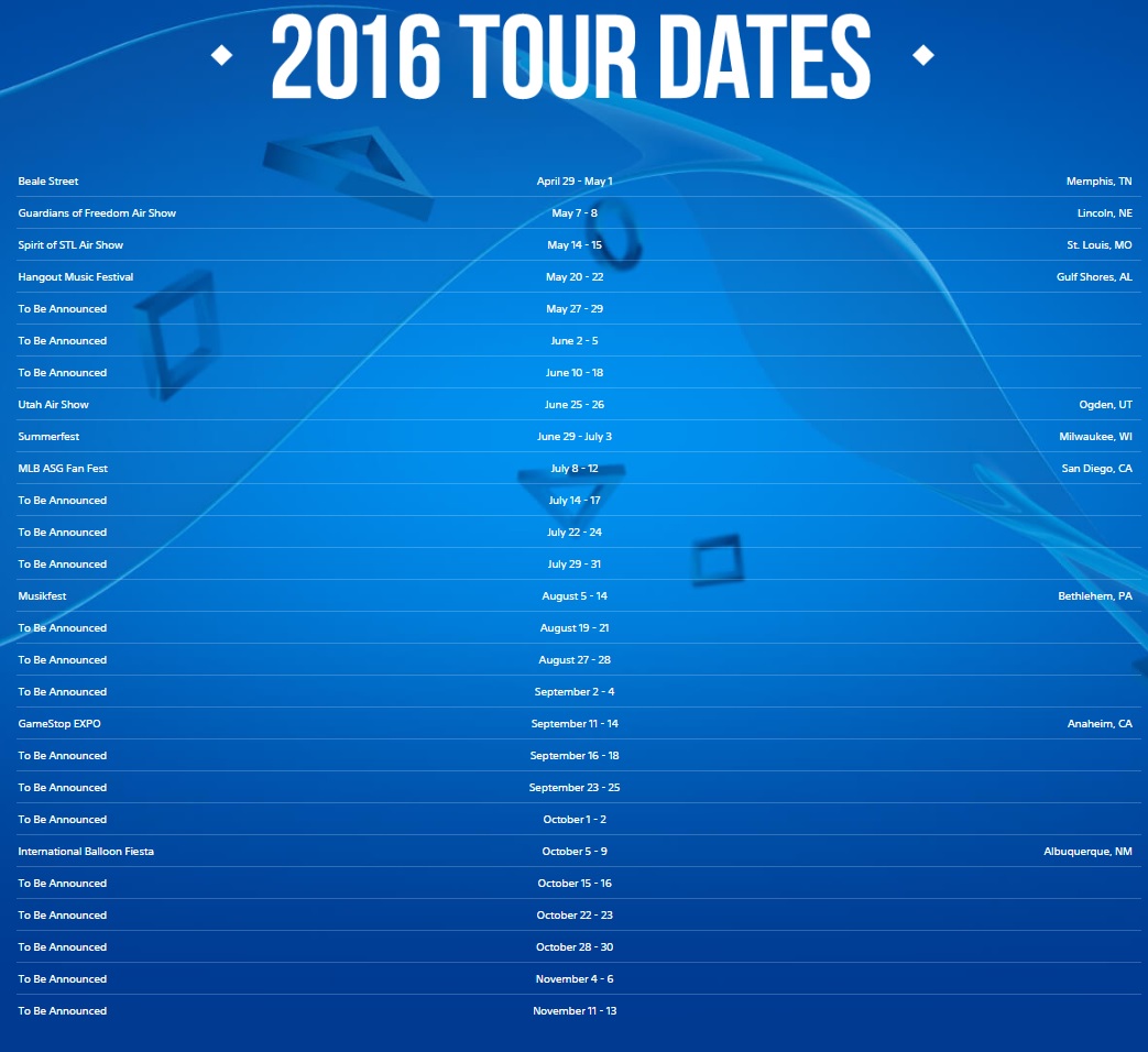 The tour started this weekend and is currently stationed on Beale Street in Memphis, TN before it’s next scheduled stop at the Guardians of Freedom Air Show at Lincoln, NE from May 7th. (click image below for larger version).