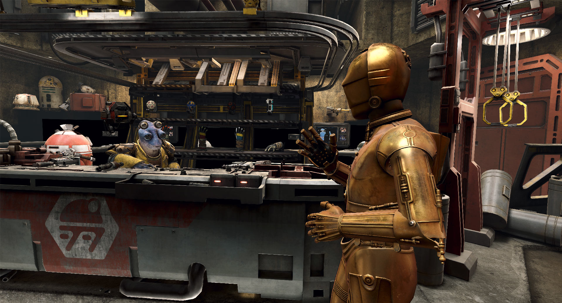 Star Wars: Tales from the Galaxy’s Edge puts you in the shoes of a droid technician whose ship is boarded by a band of Guavian Death Gang pirates while in orbit above the desert planet Batuu. The First Order is offering up serious cash for some mysterious cargo in your ship’s hold, but under the threat of death you jettison the precious cargo and flee the ship, finding yourself back at Batuu’s Black Spire Outpost where you battle the pirates in your search of the cargo.
