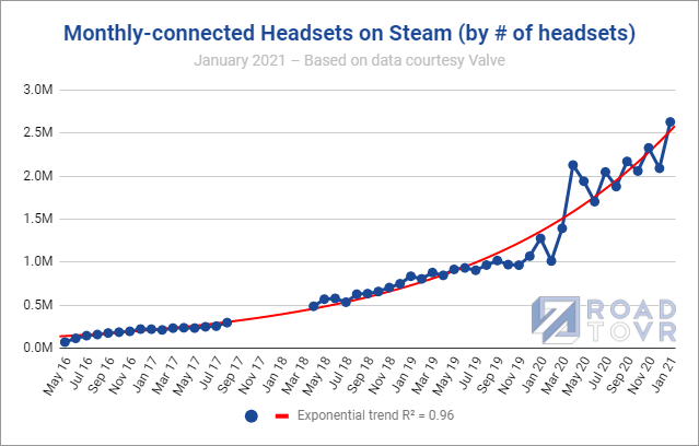 While Valve’s data is a useful way see which headsets are most popular on Steam, the trend of monthly-connected headsets has always been obfuscated because the data is given exclusively as percentages relative to Steam’s population—which itself is an unstated and constantly fluctuating figure.
