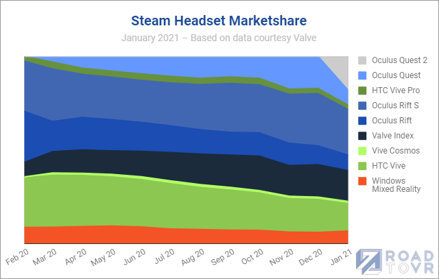 The jump is meaningful, but not quite as sudden as it might seem. This is the first month that Valve has split Quest 2 into its own category in the data; in the prior months following the launch of Quest 2, it appears that both Quest and Quest 2 were lumped into the same category.