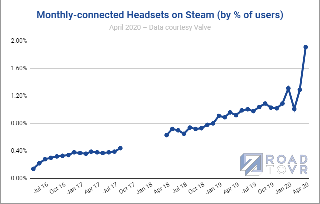 The latest figures from April show that 1.91% of Steam users had a VR headset connected to their PC over the course of the month. This is far and away the record high so far, and the largest single-month leap, nearly three times the prior record held by December–January during the 2019 holiday season.