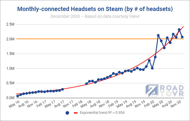 To put the milestone into perspective: it took 40 months for Steam to reach 1 million monthly-connected headsets, but just 7 months after that to reach 2 million. Year-over-year, the number of headsets is up 94%.