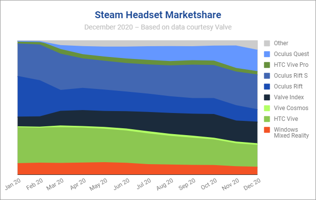 As for the share of headsets on Steam, we can see competition heating up over the course of 2020. Whereas at the start of the year the share was largely dominated by three headsets—Oculus Rift S, Oculus Rift, HTC Vive—by the end of 2020 there’s five headsets vying for the bulk of VR users—the aforementioned three, plus Valve Index and Oculus Quest.
