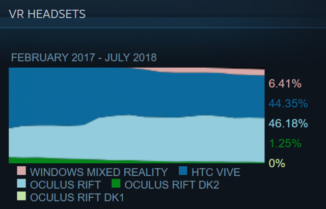The July numbers show the Oculus Rift continuing its slight lead in headset marketshare on Steam, now a six month streak, at 46.18% (−0.08%) over the HTC Vive at 44.35% (−0.21%). Meanwhile Windows VR headsets gain slightly from those loses, now at 6.41% (+0.16%).