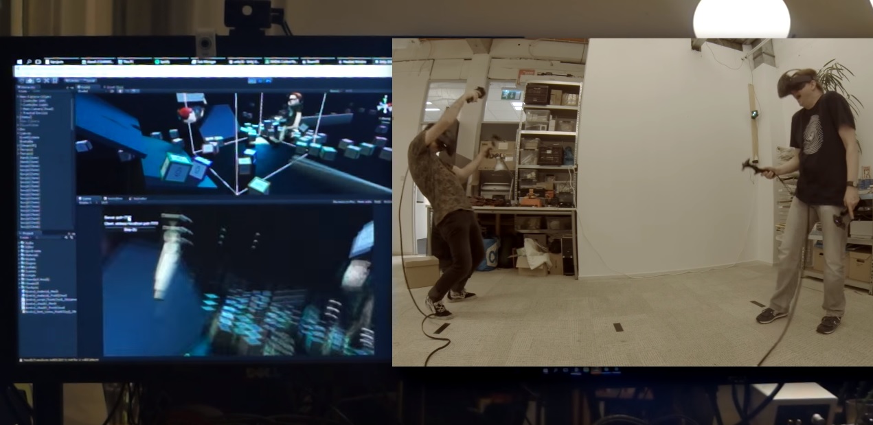 The video above demonstrates the two developers working within the same physical space, with a point cloud for each person’s physical self generated using a Microsoft Kinect for Windows depth camera rendered correctly positioned in VR. The benefits for this are that, your in-game compatriot can see where you are when blind to the real world, especially handy when they’re sharing the same physical space.