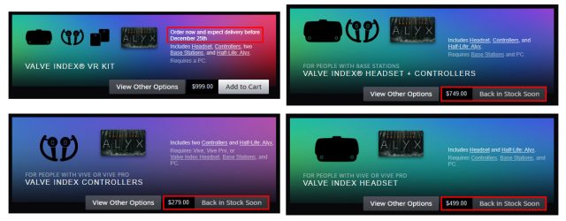 Following last week’s announcement of Half-Life: Alyx, most Index packages—the headset-only, controllers-only, and headset + controller packages—are currently listed in the US and Canadian stores as sold out with a ‘Back in Stock Soon’ message in place of the order button.
