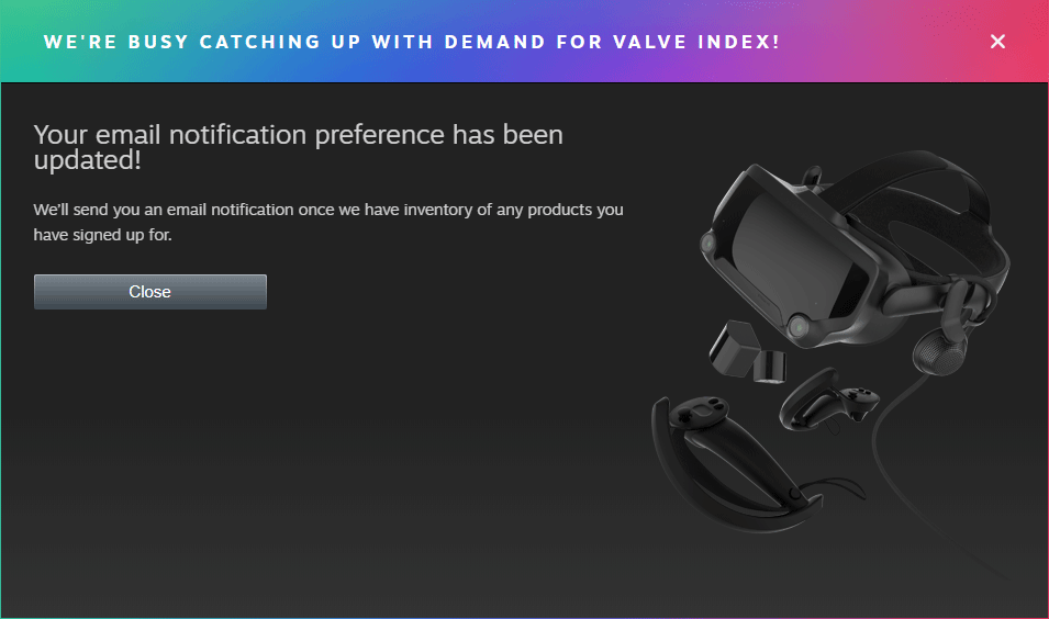 In response to the demand, Valve appears to have revamped its Index page to make it easier to know when Index is back in stock. Where a simple ‘Back in Stock Soon’ message used to reside, all pages now have a ‘Notify Me’ button allowing logged-in users to sign up for an alert when stock becomes available. The message at the top of the window reads, “We’re busy catching up with demand for Valve Index!”
