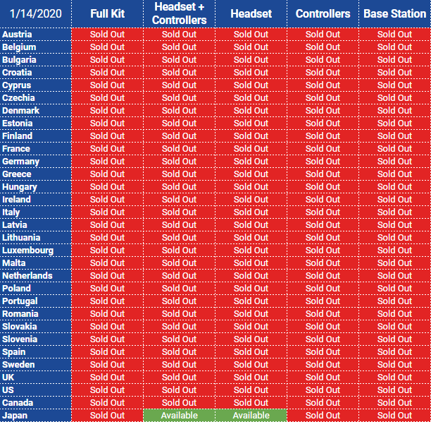 Update (January 14th, 2020): After a comprehensive check of Valve Index stock and availability in all 31 countries in which Index is sold, we found that the headset is sold out across the globe.